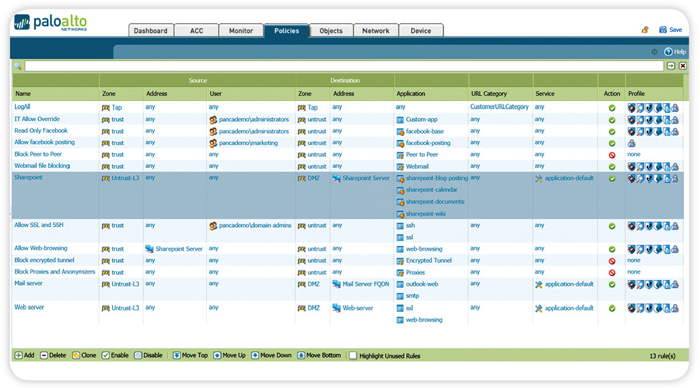 App-ID continually monitors the state of an application to see if it changes midstream, provides updated information to your administrator in ACC, and applies the appropriate policy and logs the information. Like all firewalls, Palo Alto Networks next-generation firewalls use positive control, default-deny all traffic, and then allow through only those applications that are within your policy. Everything else is blocked.